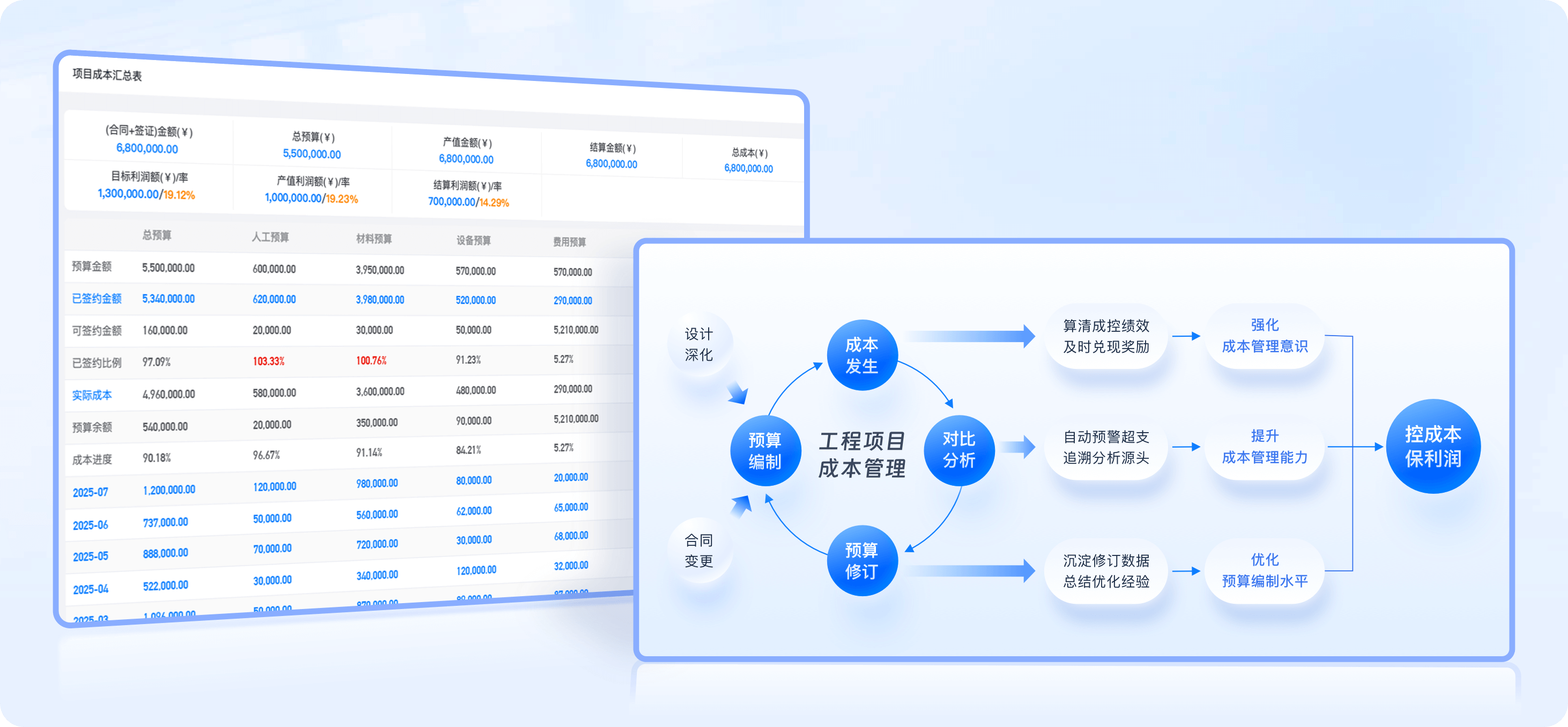 工程行业的利润空间取决于项目成本管理能力,成本的每一笔超支就是利润的丢失。线下管理成本模式中,项目成本支出口径繁杂(人工、材料、机械、杂费等),数据分散在各个业务部门,不仅归集难度大准确性低,更难与当初做的预算实时比对,往往要到结算付款后才发现成本超支,只能被动“救火”补救,错失成本控制时机,造成利润减少甚至亏损。