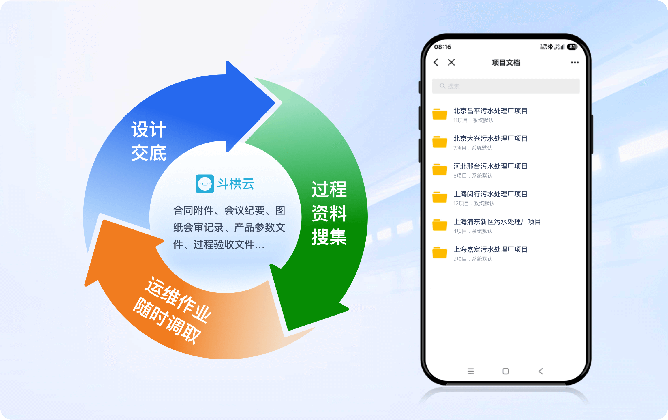 EPCO 项目竣工后进入运维阶段,日常进行运维作业需要调用施工环节的技术参数与过程数据,在没有启用斗栱云之前,汉青环保在文档管理意识方面在行业中走在前列,专门配备了专属文件服务器进行施工文档存储,但难免有时会存储不及时有遗漏(如投标文件存于业务部、技术交底图存于工程部、结算凭证存于财务部),在运维阶段出现查找困难、版本错误等问题,甚至运维时调用的文件与实际施工记录不符。
