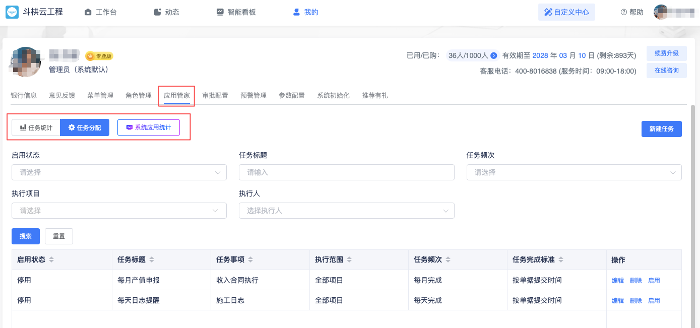 【任务分配】列表展示每条任务设置情况,支持新增、编辑、删除、停用任务,任务停用或启用及时生效