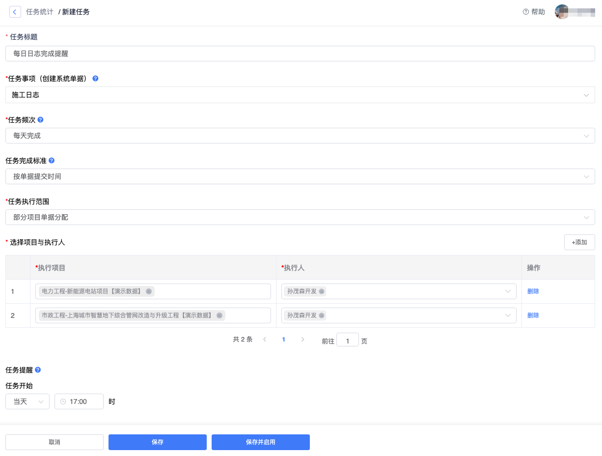 任务执行范围 | 分为全部项目(默认项目负责人执行)、部分项目单独分配,切换到“部分项目”时,需要选择“项目与执行人” |