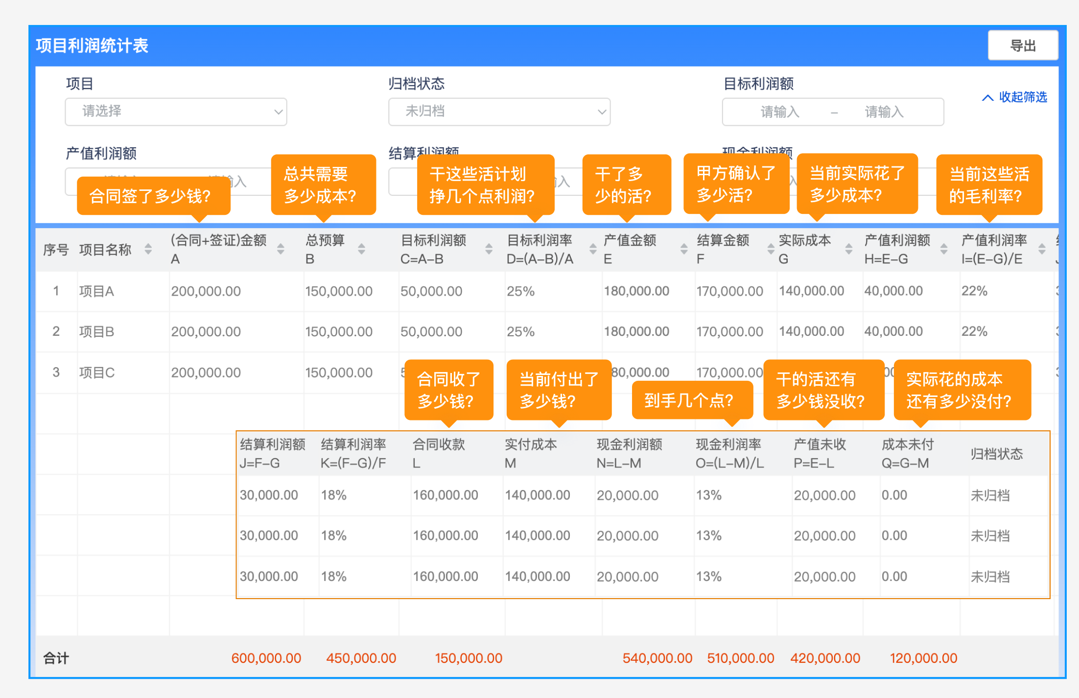 原有基本上新增汇总【合同收款、实付成本、现金利润额/率】;