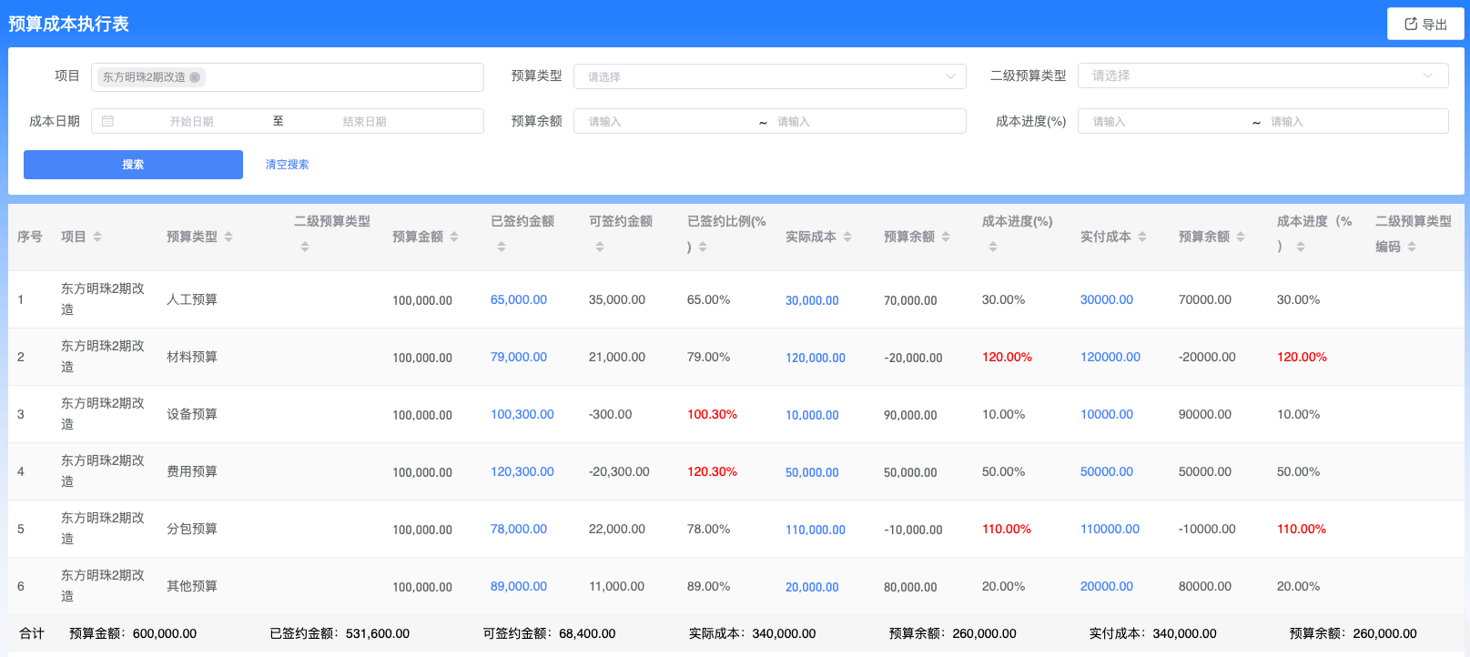 六大类新增【实付成本、预算余额、成本进度】统计;