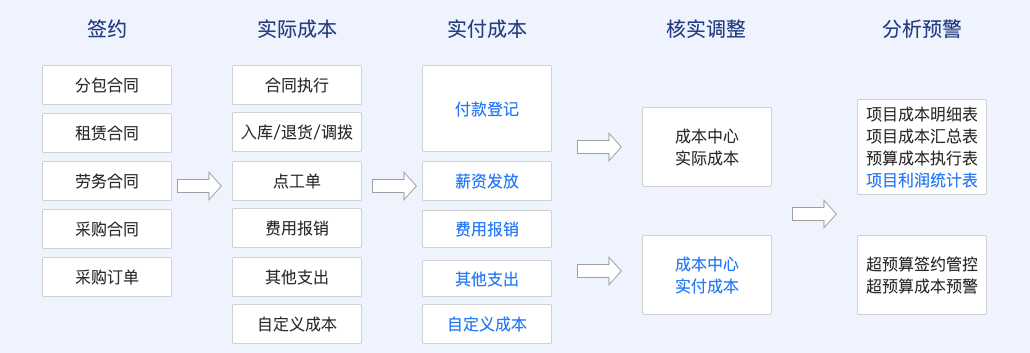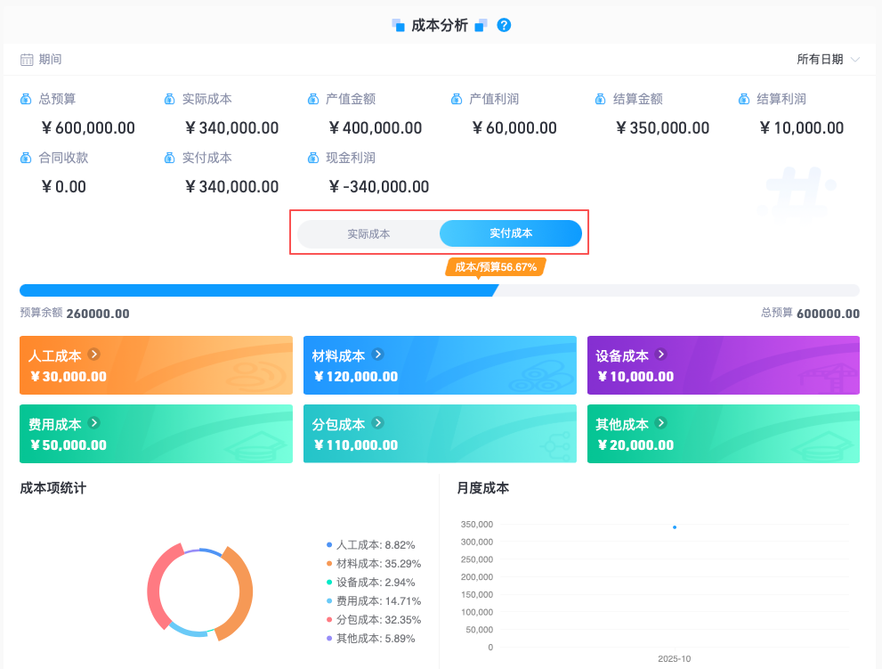 实付成本:指工程项目在特定周期内,实际向供应商、分包商、员工等支付的现金/银行款项,即“已付出去的钱”。 核心是“支付即成本”;
