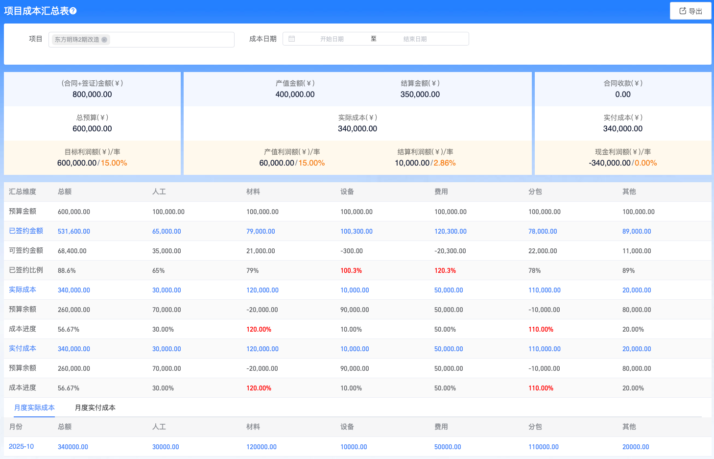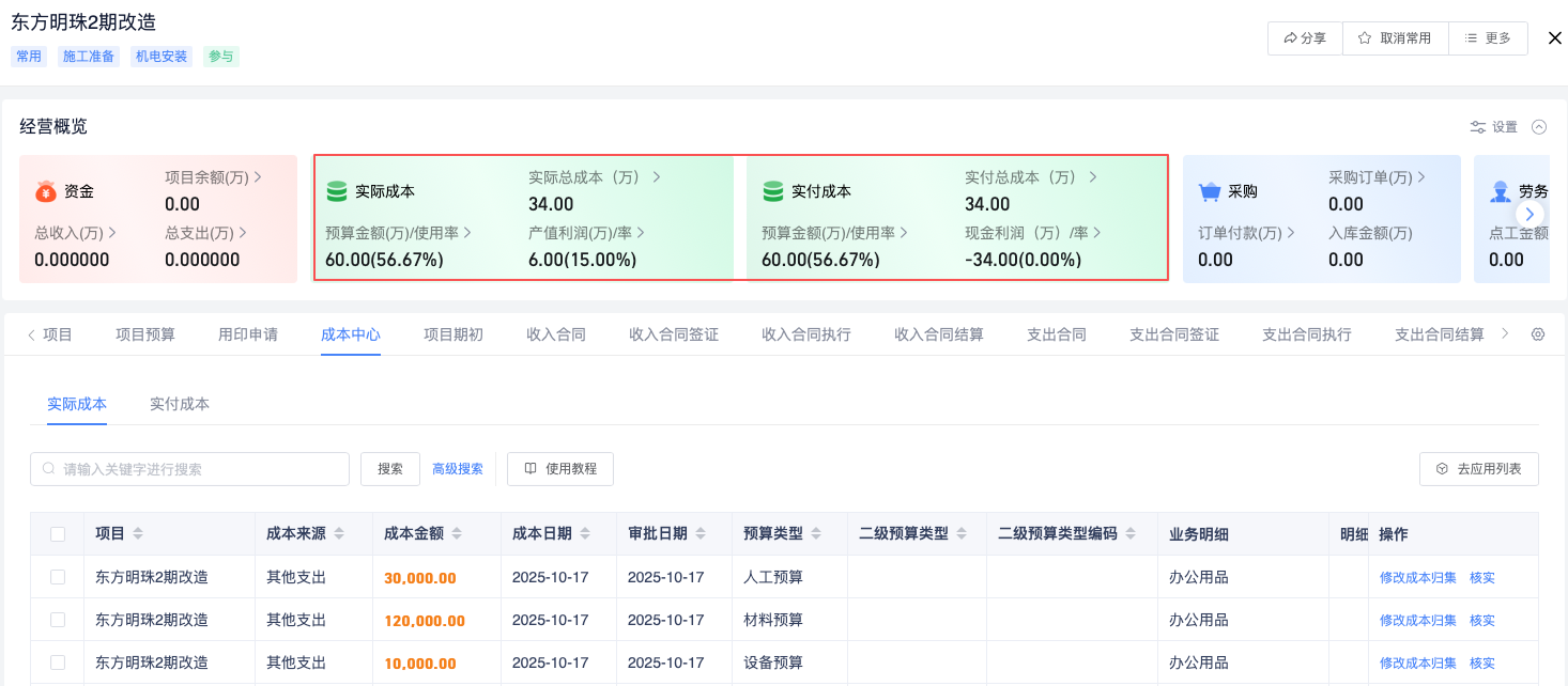项目详情,新增汇总卡片【实付成本】原成本改为“实际成本”;