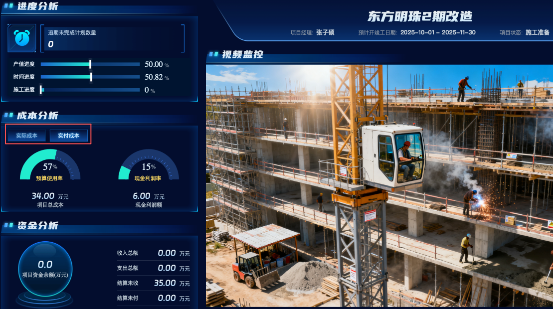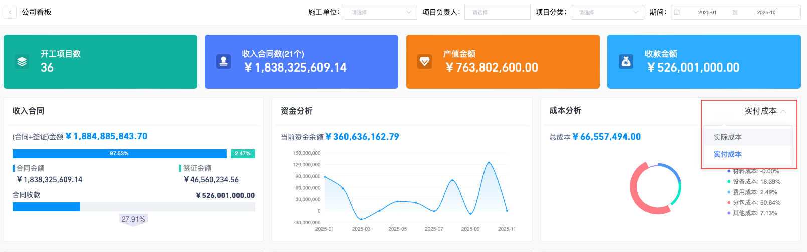 新增汇总【合同收款、实付成本、现金利润】统计,项目看板/公司看板/项目大屏支持实际成本与实付成本切换