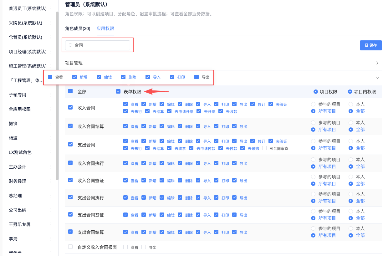 2)应用权限,支持快速搜索查找单据,每个应用模块支持批量勾选常用权限(模块中大于等于3个相同权限则支持批量操作)