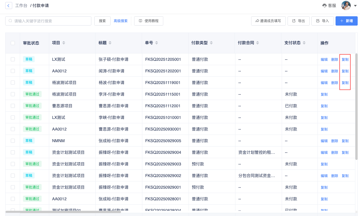 复制功能不限单据审批状态,在本人可见范围内,任意状态下都支持复制新增一笔(草稿状态)