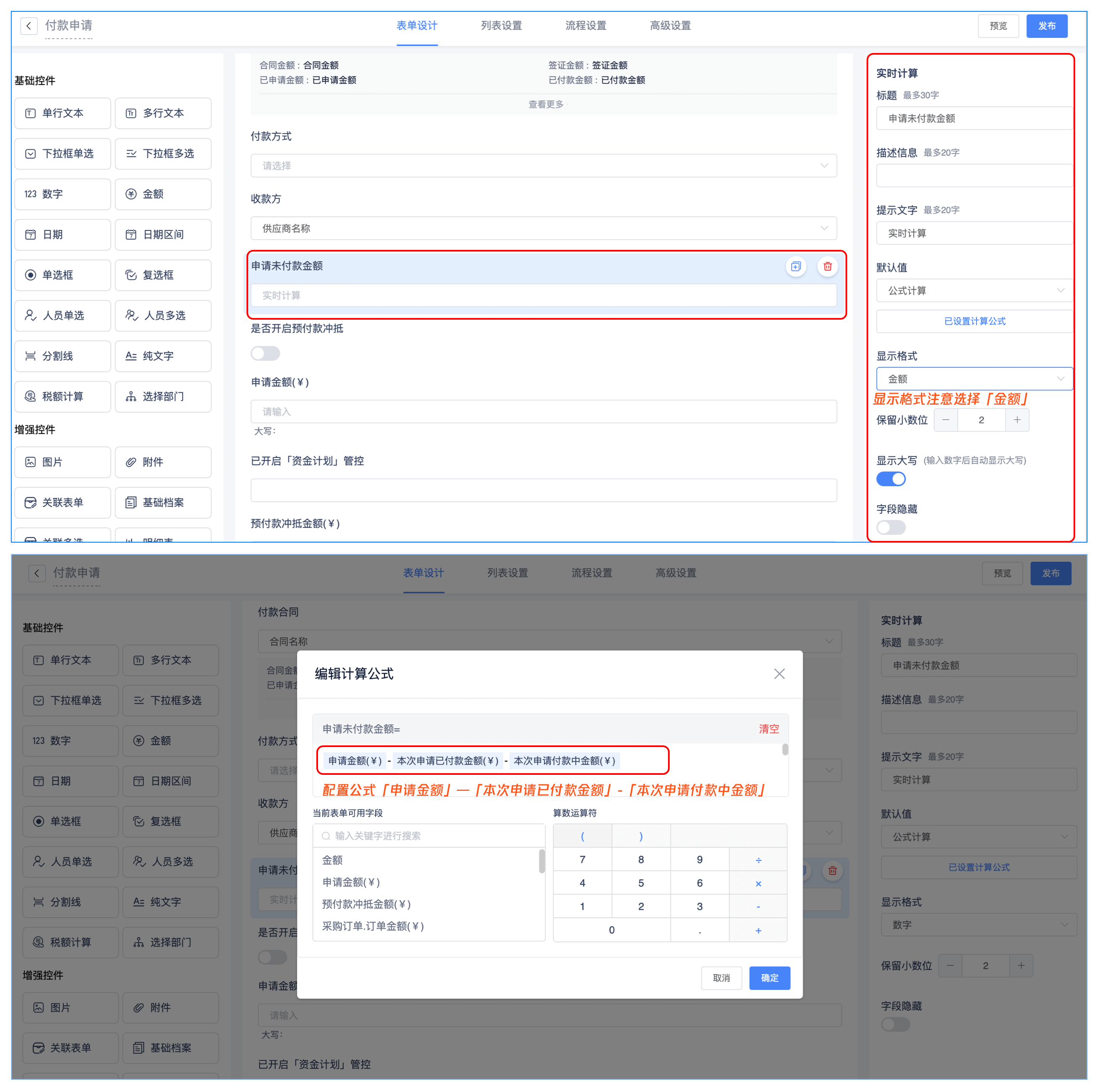 1、在「表单设计-付款申请」中添加“实时计算”控件,默认值设置为「申请金额—本次申请已付款金额、本次申请付款中金额」