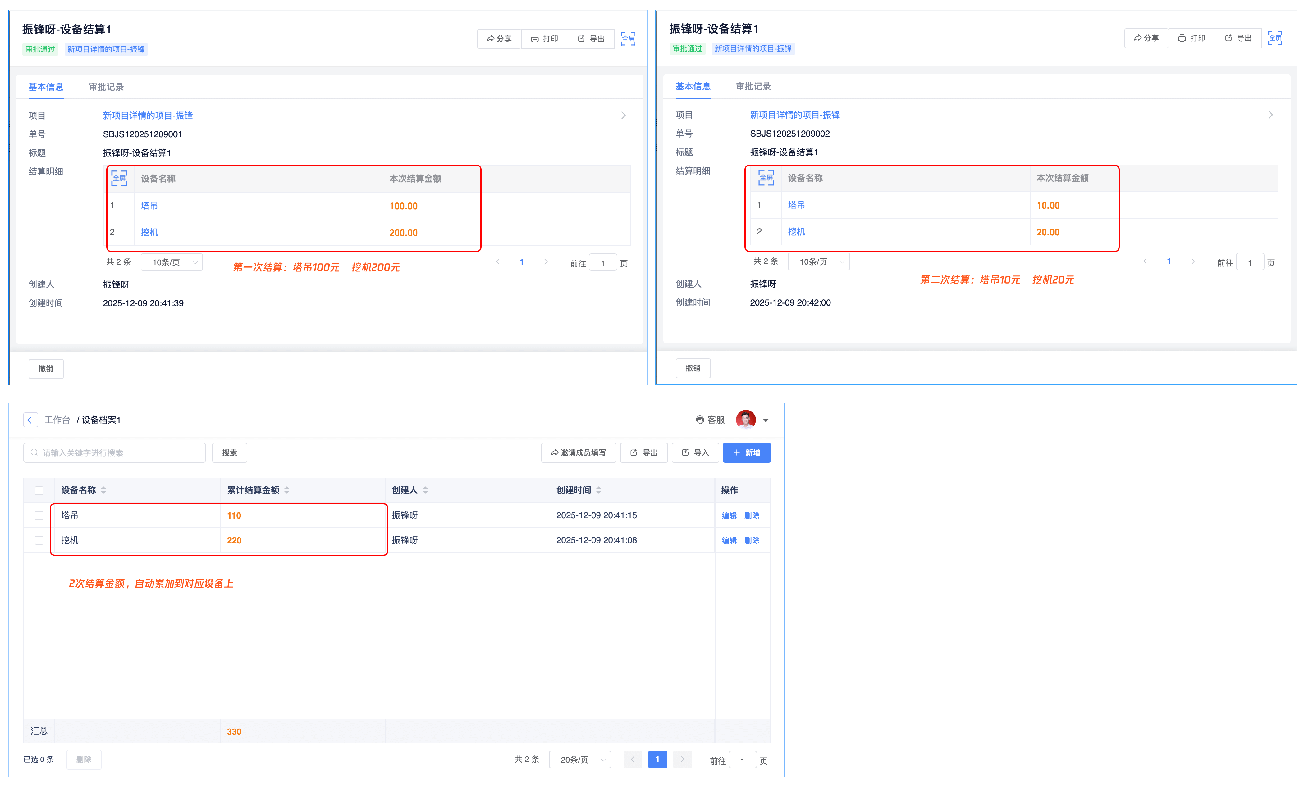 2、【设备结算】审批通过后,自动反写【设备档案】:「累计结算金额」